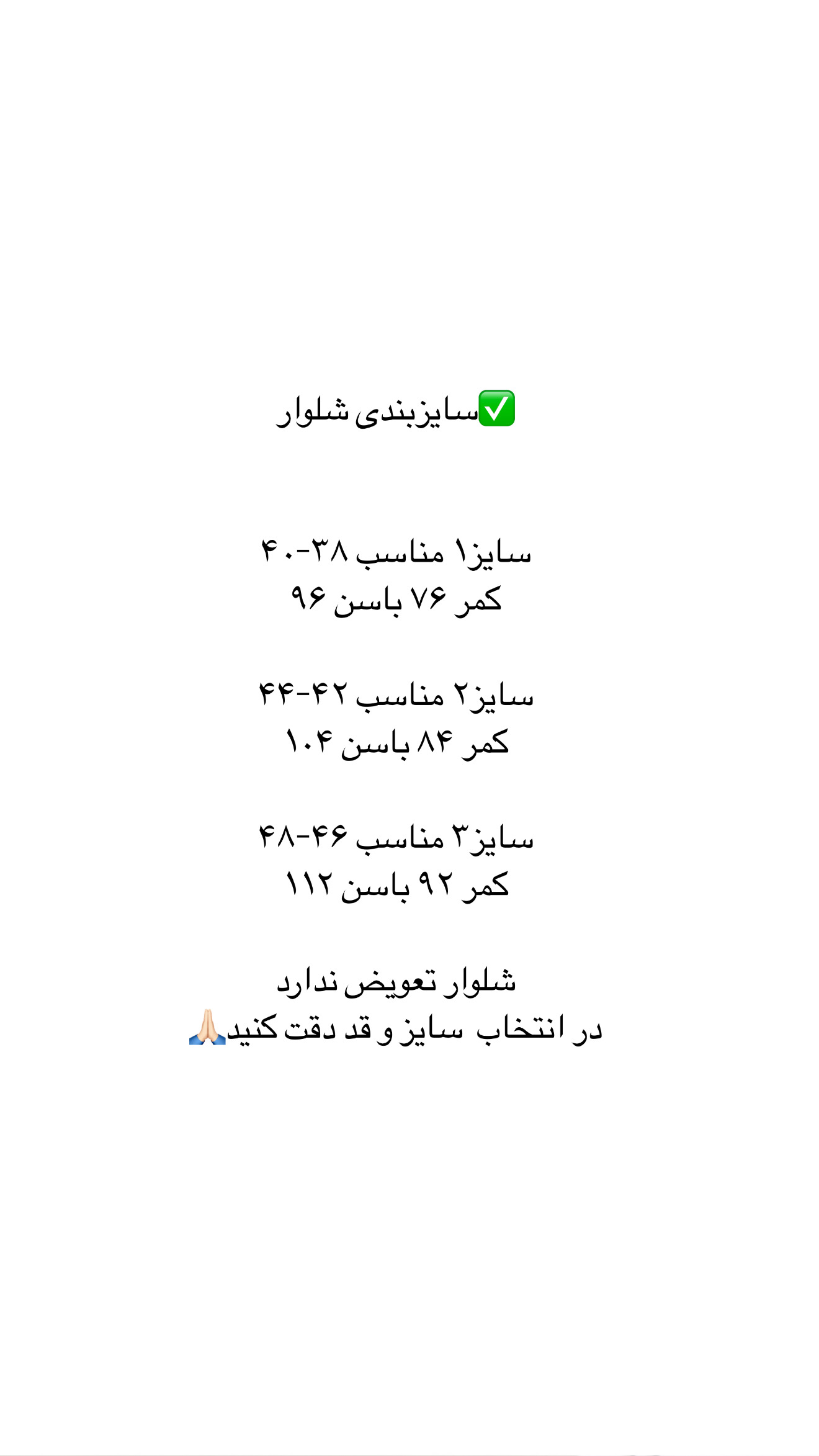 سایزبندی شلوار طبق اندازه کمر و باسن جدول میباشد(اسلاید عکس ها)